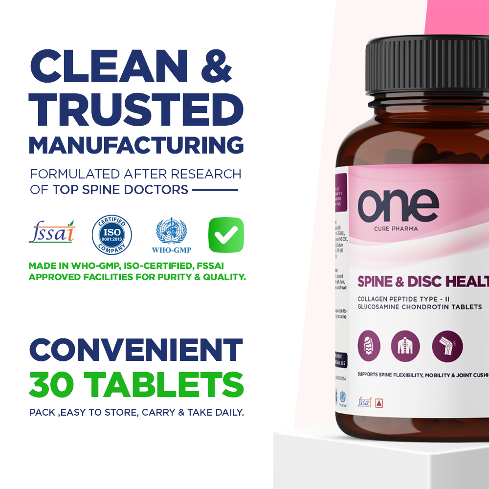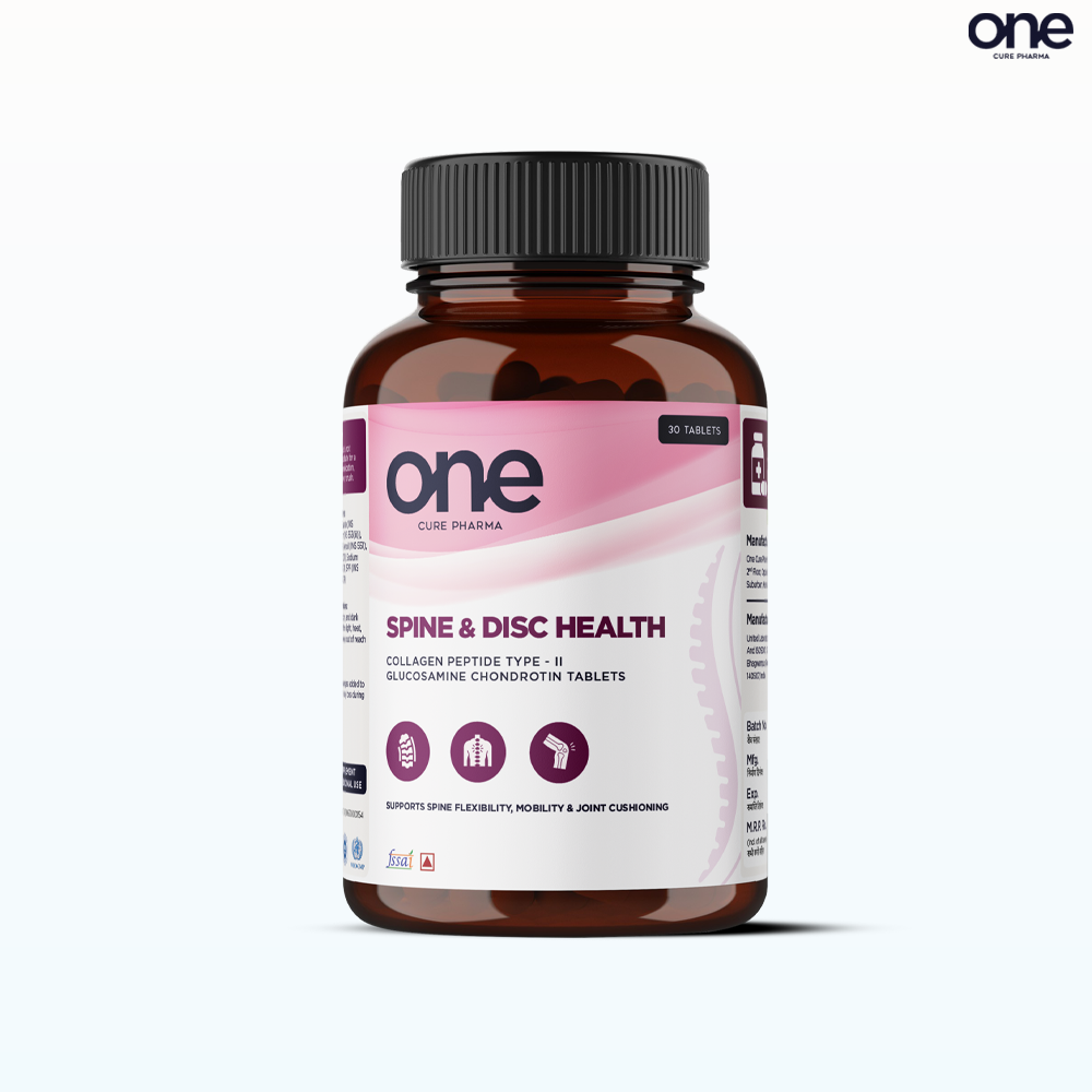 Hereby introducing One Cure Pharma’s Spine & Disc Health. It is a nutraceutical created by a doctor it has Collagen Type-II, Glucosamine, Chondroitin, and Ginger extract used for cushioning, flexibility, and reducing inflammation. Plus, it's packed with essential vitamins and minerals like B1, B2, Vit E and Copper each at 100% of the Recommended Daily Allowance as per ICMR guidelines along with these it includes vit B5, vit C, manganese and zinc all supporting tissue repair, mobility, and spine strength.